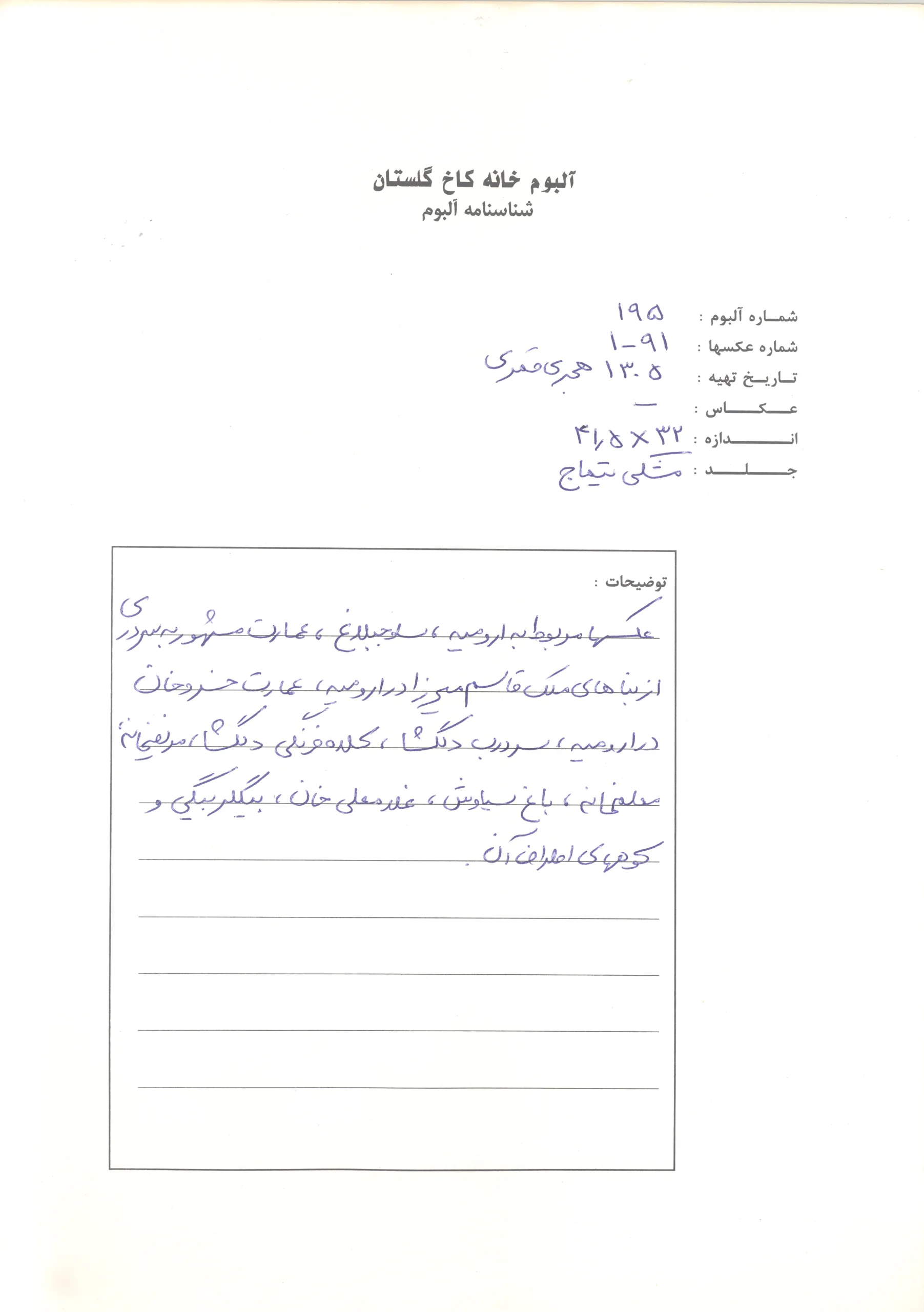 عکس ها مربوط به ارومیه، ساوجبلاغ، عمارت مشهور به سردری از بناهای ملک قاسم میرزا در ارومیه، عمارت خسروخان در ارومیه، سر درب دلگشا، کلاه فرنگی دلگشا، مریضخانه، معلمخانه، باغ سیاوش، غلامعلی خان، بیگلربیگی و کوه های اطراف.